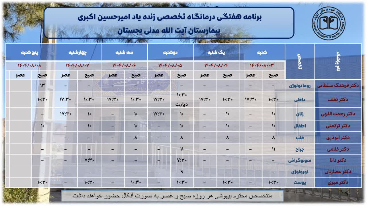 کلینیک تخصصی بیمارستان همه روزه به استثناء روزهای تعطیل در دو شیفت صبح و عصر فعال می باشد.